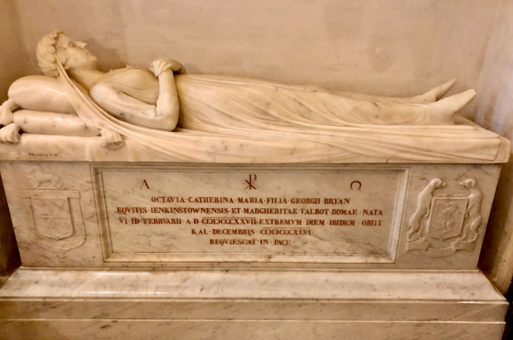 Ós comhair altóir Naomh Proinsias amach feictear dealbh Catherine Bryan, agus í ar a leasluí ansin. Ba chailín óg í a tholg an fiabhras agus a shaothraigh an bás as agus í ar cuairt don Róimh i 1864. Ba iníon í leis an gCoirnéal Seóirse Bryan as Éirinn, fear a raibh lámh ar leith aige i nGluaiseacht na Fuascailte Caitlicí. Is cosúil go raibh John Henry Newman (ar oirníodh é ina Chairdinéal blianta ina dhiaidh sin) ag staidéar sa Róimh, a chomhuain is a tharla sin agus é ina dhéagánach tar éis dó iompú ón gcreideamh Anglacánach. D’iarradh air seanmóir a thabhairt ag sochraid iníon an Choirnéal Bryan agus ba é sin an chéad sheanmóir a thug sé uaidh agus é ina Caithliceach. Tá sin breactha síos ag Newmann ina dhialann ar an lá sin.