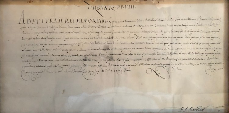 San Aula Maxima (Halla Mór) feictear pictiúir freascó a thaispeáineann Lúcás Uaidín agus a chompánaigh tosaigh. Faoin fhreascó sin, tá leac a mheabhraíonn dúinn gur tháinig an Cairdinéal Corsini ansin ar Lá Fhéile Pádraig sa bhliain 1737 mar a rinneadh a réamhtheachtaithe ar an ócáid chéanna roimhe sin. Ar an lá sin, d’insealbhíodh an Cairdinéal mar Choimirceoir an Suí Naofa ar Ríocht na hÉireann. Maisíodh an Halla Mór i 1672 le honóir a thabhairt do Ghiniúint Mhuire Gan Smál. Tugann na pictiúir ómós do Duns Scotus Beannaithe agus do Naomh Bonaventura. Ba éard a cheap an bheirt sin nárbh fhéidir teagasc Ghiniúint Mhuire Gan Smál a chruthú go cinnte, cé go raibh sé fíor agus gur chreid na fíréin i gcónaí ann. B’amhlaidh a bhí tuairim Naomh Tomás Acuin mar an gcéanna.
