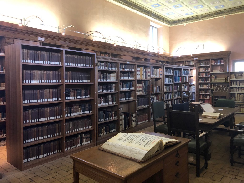 The patrimony of this library is made up of about 24,000 volumes, dated pre-1900, subdivided between manuscripts (about 280), “incunabula” (72), books of the 16th century (1,060), books of the 17th century (3,100), books of the 18th century (2,100), about 150 other books yet to be catalogued, probably from the 17th century, and “modern” books (16,946, and about 600 others not catalogued) generally belonging to the 19th century. There are also some books edited after 1900, retained because they have particular relevance, or because of rarity, or because connected with the main thrust of the library, or because of their importance for study or consultation.